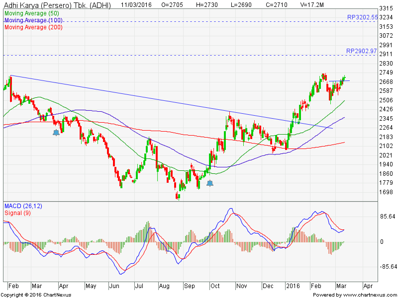 ADHI berhasil mencapai target kenaikan awalnya seperti yang telah direkomendasi di awal tahun: ‘Skenario Pergerakan ADHI Menuju New All Time High-nya‘. Saat ini konsolidasi minor ADHI berpotensi berakhir. Kemampuan ADHI menguat melampaui 2675 membuka peluang kenaikan menuju level all time high baru di 2900. Jika momentum kenaikan dapat dipertahankan, target selanjutnya adalah >3200. MACD yang telah golden cross menunjukkan saham ini bergerak positif.
