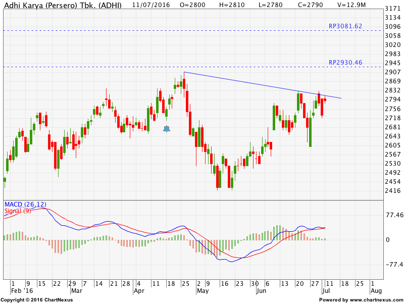 ADHI berkonsolidasi menguji area resistennya di level 2830. Melanjuti ulasan ADHI sebelumnya: ‘ADHI Berpeluang Melanjutkan Tren Naiknya‘, ADHI saat ini berada dalam posisi uptrend untuk fase jangka panjangnya. Jika ADHI mampu menguat menembus resisten 2830, saham ini berpeluang besar break all time high menuju 3080 dengan minor target 2930. Target jangka menengah saham ini berada di level 3490 jika momentum kenaikan dapat terjaga.