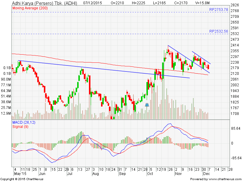 ADHI saat ini tengah berkonsolidasi sehat di atas MA200-nya. Kemampuan bertahan di atas MA200 akan membuka peluang kenaikan dimana target kenaikan ADHI berada di level 2750 dengan minor target 2530. MACD yang masih menurun menunjukkan saham ini masih bergerak negatif dalam jangka pendek, namun selama masih berada di atas support 2160, peluang naik tetap terbuka.