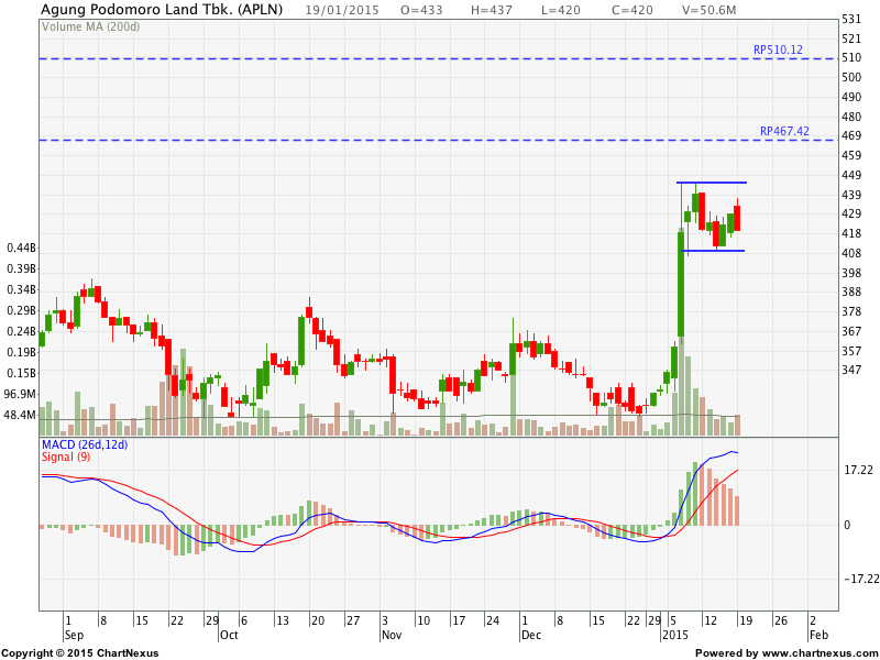 APLN berkonsolidasi sehat pasca kenaikan tajam beberapa waktu lalu. Range konsolidasi APLN berada di kisaran 410 – 445. Jika APLN mampu bertahan di atas support konsolidasi 410, terbuka peluang kenaikan menuju target selanjutnya di 510 dengan minor target 467. MACD yang cenderung mendatar mengindikasikan saham ini masih akan melanjutkan konsolidasi untuk beberapa waktu kedepan.