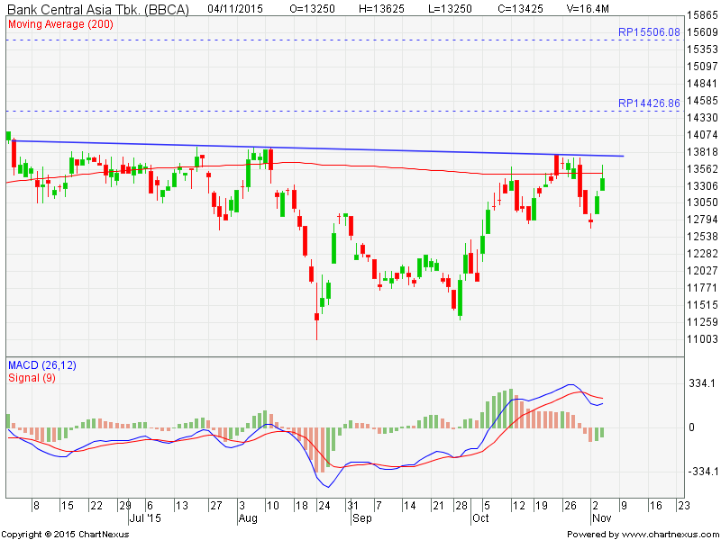 BBCA tengah menguji 2 area resisten yaitu resisten konsolidasi dan MA200 di kisaran 13725 – 13775. Jika area ini dapat dilampaui, BBCA berpeluang kembali bergerak dalam tren naik menuju targetnya di 15500 dengan minor target 14425. MACD yang mendatar menunjukkan saham ini berada di akhir konsolidasinya.