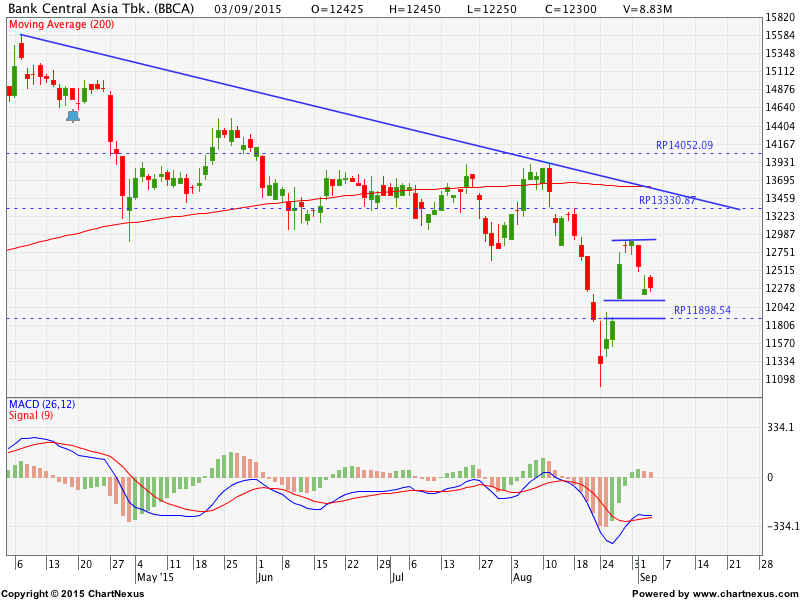 BBCA berkonsolidasi di atas area gap 11900 – 12150 yang berpeluang menjadi area support. Jika BBCA mampu bertahan di atas area ini, terbuka peluang kenaikan menuju resisten di 12900. Jika nantinya 12900 berhasil dilampaui, terbuka peluang kenaikan menuju 14050 dengan minor target di 13325 (Resisten MA200).