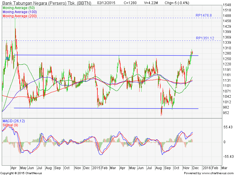 Perhatikan range konsolidasi BBTN di atas. Saat ini BBTN telah berada di atas resisten konsolidasi yang terbentuk sejak bulan April 2014, berarti BBTN berkonsolidasi hampir 2 tahun lamanya. Hal ini mengindikasikan saham ini berpeluang kembali bergerak dalam fase tren naik. Jika BBTN mampu bertahan di atas resisten 1270 dalam beberapa waktu kedepan, terbuka peluang kenaikan bagi saham ini menuju 1475 dengan minor target di 1350. MACD yang meningkat menunjukkan saham ini bergerak positif.