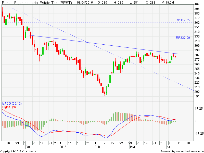 BEST saat ini berkonsolidasi menguji resist line-nya di 286. Kemampuan BEST menguat dan bertahan di atas level tersebut akan membuka ruang kenaikan menuju 362 dengan minor target 322. MACD yang berpeluang golden cross menunjukkan saham ini berpeluang bergerak positif.