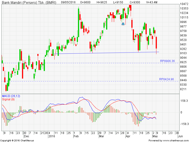 BMRI saat ini berada di titik kritisnya. Support 9275 sempat ditembus mengindikasikan saham ini berpeluang memasuki tren turun. Hati – hati jika BMRI tidak mampu bertahan di atas 9275, maka terbuka ruang penurunan menuju 8425 dengan minor target 8900. MACD yang dead cross menunjukkan saham ini bergerak dalam fase negatif.