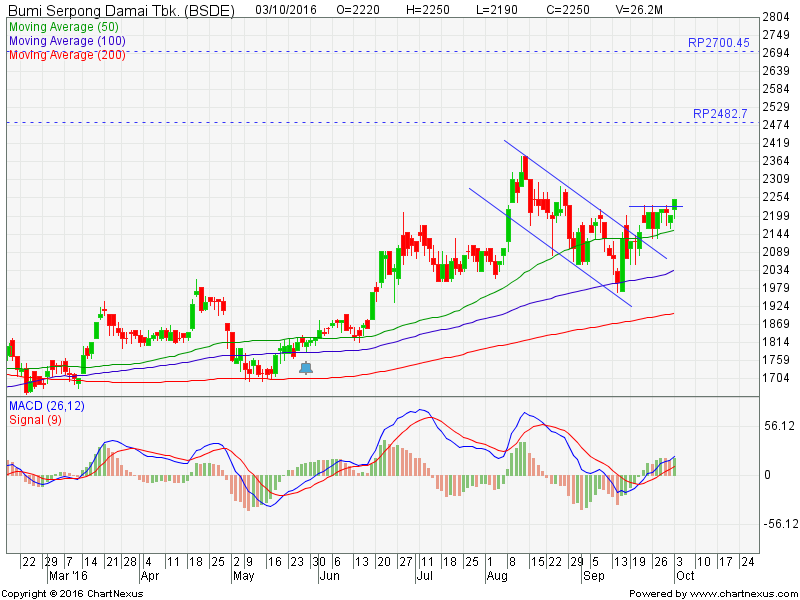 BSDE menguat menembus down trend channel dan resisten konsolidasinya di 2230. Hal ini membuka peluang bagi BSDE untuk kembali bergerak dalam tren naik jangka panjangnya. Jika mampu bertahan di atas resisten 2230, terbuka peluang kenaikan menuju 2700 dengan minor target 2480. MACD yang meningkat menunjukkan saham ini bergerak positif.