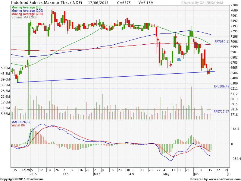 INDF saat ini berada di area support kuatnya di 6550. Terbuka peluang untuk rebound, namun rebound dalam tren turun. Target rebound berada di area MA200 di kisaran 7050. Dengan demikian, selama INDF masih berada tidak lebih tinggi dari 7050, saham ini masih cenderung akan melanjutkan tren turunnya. Hati – hati jika support 6550 ditembus, INDF berpeluang melanjutkan pelemahan menuju 5725 dengan minor target 6200. MACD yang menurun menunjukkan saham ini bergerak negatif.
