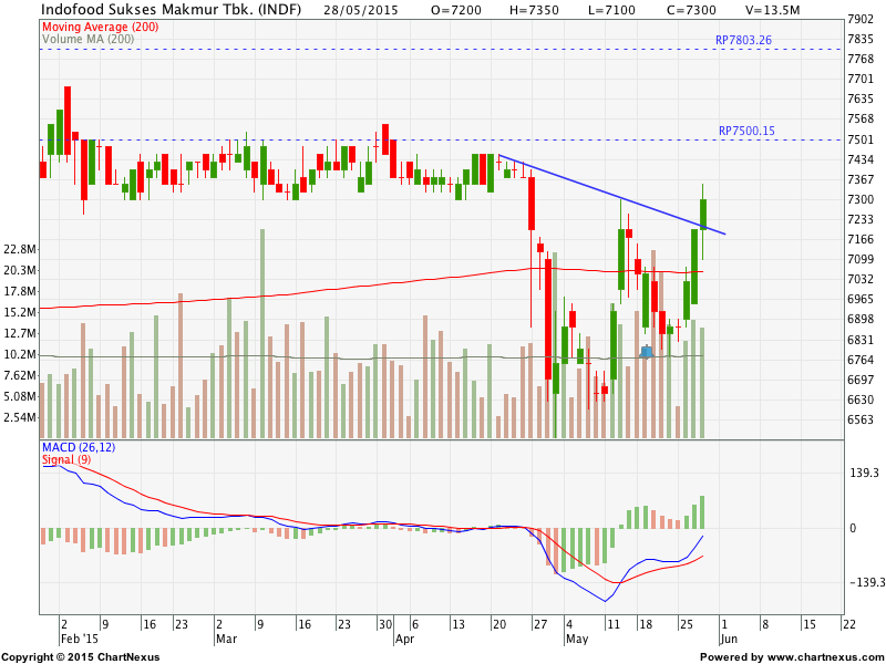 DI tengah penurunan pasar, INDF berhasil kembali ke atas resisten psikologis MA200 dan melampaui resisten konsolidasinya di level 7300. Hal ini membuka peluang bagi INDF untuk menguat menuju target selanjutnya di 7800 dengan minor target 7300. Terbuka peluang untuk terjadinya konsolidasi, namun selama masih berada di atas support 6775 maka konsolidasi tersebut bersifat wajar. MACD yang meningkat menunjukkan saham ini bergerak positif.