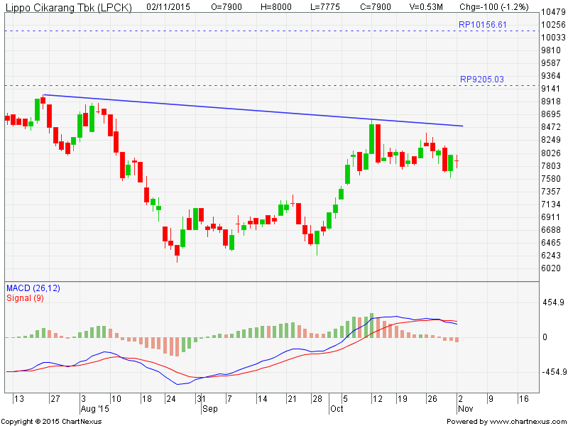 LPCK bergerak dalam fase konsolidasi di bawah area down trend resist line-nya di 8375. Jika LPCK mampu bertahan di atas support konsolidasinya di 7750, maka peluang saham ini untuk menguat menjadi lebih besar. Jika nantinya LPCK mampu menembus resisten 8375, terbuka peluang bagi saham ini untuk memasuki fase tren naik menuju 10150 dengan minor target 9200. MACD yang masih menurun menunjukkan saham ini masih cenderung melanjutkan konsolidasinya.