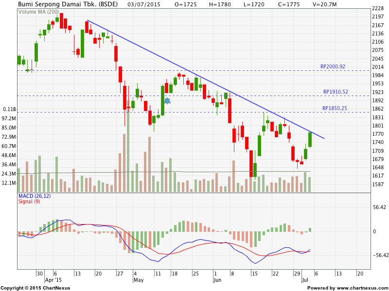 BSDE menguat dalam fase tren turunnya. Saat ini BSDE tengah menguji area resist line di kisaran 1830 – 1850. Jika level ini dapat dilampaui, BSDE berpeluang besar mengakhiri tren turunnya dan menguat menuju target awal di 2000 dengan minor target 1910. MACD yang meningkat menunjukkan saham ini bergerak positif.