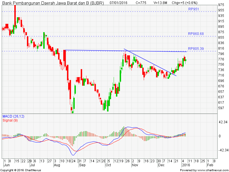 BJBR bergerak dalam fase tren naik jangka pendek. Seberapa besar peluangnya menjadi tren jangka menengah? Kenaikan saat ini berpotensi tertahan resisten 805 sehingga memungkinkan terjadi profit taking dan konsolidasi sementara waktu. Namun, jika 805 dapat dilampaui, BJBR berpeluang besar melanjutkan tren naik ke 950 dengan minor target 860. Walaupun bukan tren jangka panjang, saham ini tetap menarik untuk diikuti pergerakannya.