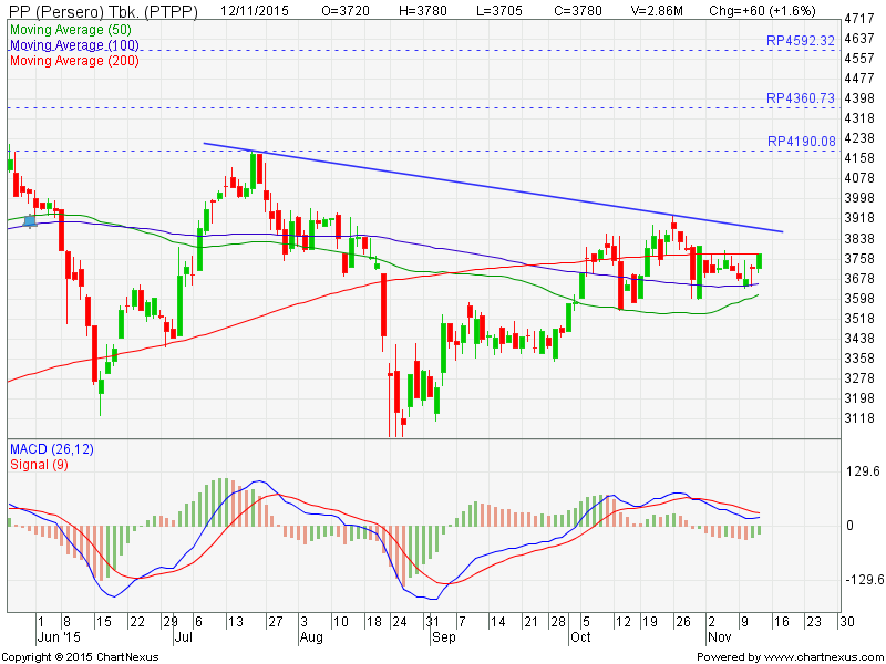 PTPP saat ini berkonsolidasi menguji rangkaian support & resisten moving average-nya di kisaran 3595 – 3790 beserta down trend resist line di 3930. Jika area resisten ini dapat dilampaui, saham ini berpeluang besar kembali memasuki fase tren naik dengan target kenaikan di 4590 dengan minor target di 4360 dan 4190. MACD yang mendatar menunjukkan saham ini berada di akhir konsolidasinya.