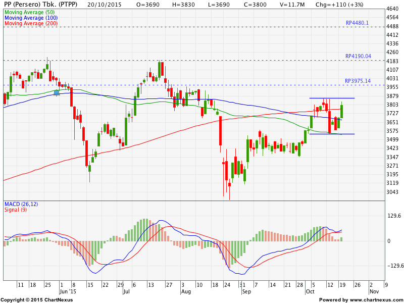 Sebagai satu dari sedikit saham yang mampu bertahan di atas MA200-nya, pergerakan PTPP wajib dicermati jika mampu menembus resisten konsolidasi di 3860. Jika level ini dapat dilampaui, terbuka peluang bagi saham ini untuk menguat menuju area all time high di 4190 – 4245 dengan minor target 3975. Melihat historis pergerakan PTPP, maka besar peluang bagi saham ini untuk break all time high setidaknya menuju 4480 jika 4245 berhasil dilampaui.