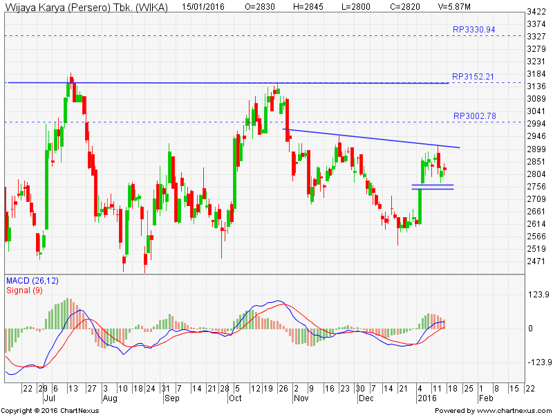 WIKA saat ini berkonsolidasi di atas area Gap 2750 – 2765. Gap umumnya menjadi support cukup kuat. Jika selanjutnya WIKA mampu menguat dan menembus resisten konsolidasinya di 2910, terbuka ruang kenaikan menuju resisten utama di 3150 dengan minor target 3000. Level 3150 memiliki peran besar terhadai pergerakan WIKA kedepan. Jika dapat dilampaui, WIKA berpeluang besar menguat menuju 3635 dengan minor target 3330. MACD yang meningkat menunjukkan saham ini bergerak positif.