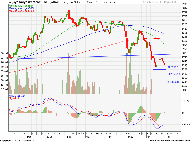 WIKA tampak mengalami kesulitan untuk mempertahankan kenaikannya. Posisi harga yang cenderung menurun kembali menuju support di 2510 menunjukkan adanya potensi penurunan lebih lanjut. Hati – hati jika support 2510 tidak mampu menahan penurunan, WIKA berpeluang melanjutkan pelemahan menuju 2180 dengan minor target 2360. WIKA baru memiliki peluang kembali dalam tren naik jika saham ini mampu menguat ke atas 2785.
